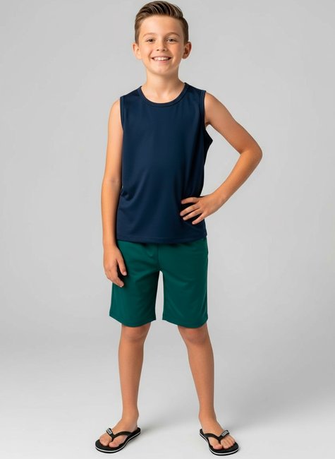 Acompanhando a camiseta, a bermuda lisa na cor verde petróleo complementa o look com um toque de cor vibrante e elegante. Confeccionado em tecidos leves e confortáveis, o conjunto garante liberdade de movimentos, caimento impecável e frescor para os dias mais quentes.